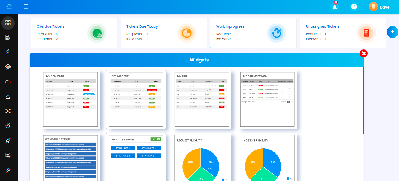 The Fabulix Admin portal enables FSM admins to monitor all tickets through customizable dashboard that includes a separate window for the following widgets:
