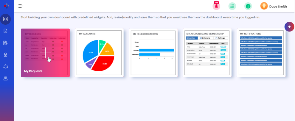 You can enable this widget to view the requests submitted by you or for yourself. The requests will include account provisioning, and group, role and entitlement membership requests.