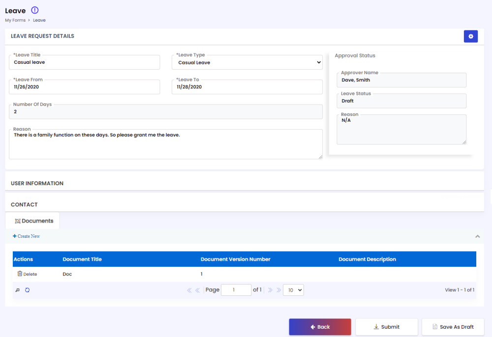 - Click the New button. The Leave Request Details, User Information, Contact and Documents sections appear.
